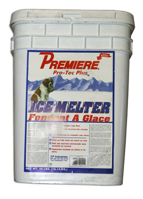 Premiere Ice Melter. Premiere makes surfaces safe for pedestrians and vehicle traffic. Effective to minus 8 degrees, this deicer works quickly and efficiently even in severe snow and ice conditions. It creates a slip-resistant surface on concrete, fences, door jams, porch railings, equipment and automobiles. Premiere offers excellent corrosion control with its blend of CMA and the corrosion inhibitor Pro-Tec Plus. This melter is easy to use, and wearing protective clothing is not necessary when making applications.