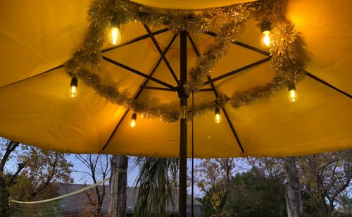 I like to hide the wire with tinsel garland, and I have on occasion included 12v mini-light strings along the outer edge of the umbrella for an even more whimsical ambiance.
